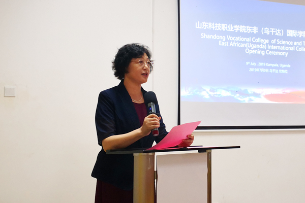 黄琦在讲话中,首先回顾了中乌两国建交55周年来的友谊与合作。她表示,中乌两国友谊源远流长,在涉及彼此核心利益和重大关切方面一直相互支持,中乌两国以及山东省和乌干达在各领域都有着广泛而深入的合作。在介绍了山东省以及山东省高等教育的基本情况,并就山东科技职业学院的发展近况、办学理念、优势特色等方面进行了专门介绍后,黄琦表示,山东科技职业学院东非(乌干达)国际学院的成立是多方合作共赢的典范,是山东科技职业学院响应国家“走出去”号召的具体体现,希望山东科技职业学院进一步加强与企业和乌干达政府的沟通,将山东科技职业学院东非(乌干达)国际学院建成我国高等职业教育改革创新和国际人才培养的排头兵,为中乌经济发展贡献更大的力量。