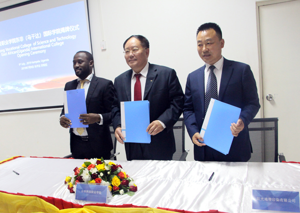山东科技职业学院院长刘桂玉、创造太阳乌干达石油学院约瑟夫•坎耶西杰、乌干达阳光地带印染有限公司董事长孙连忠共同签署《山东科技职业学院东非(乌干达)国际学院协议书》