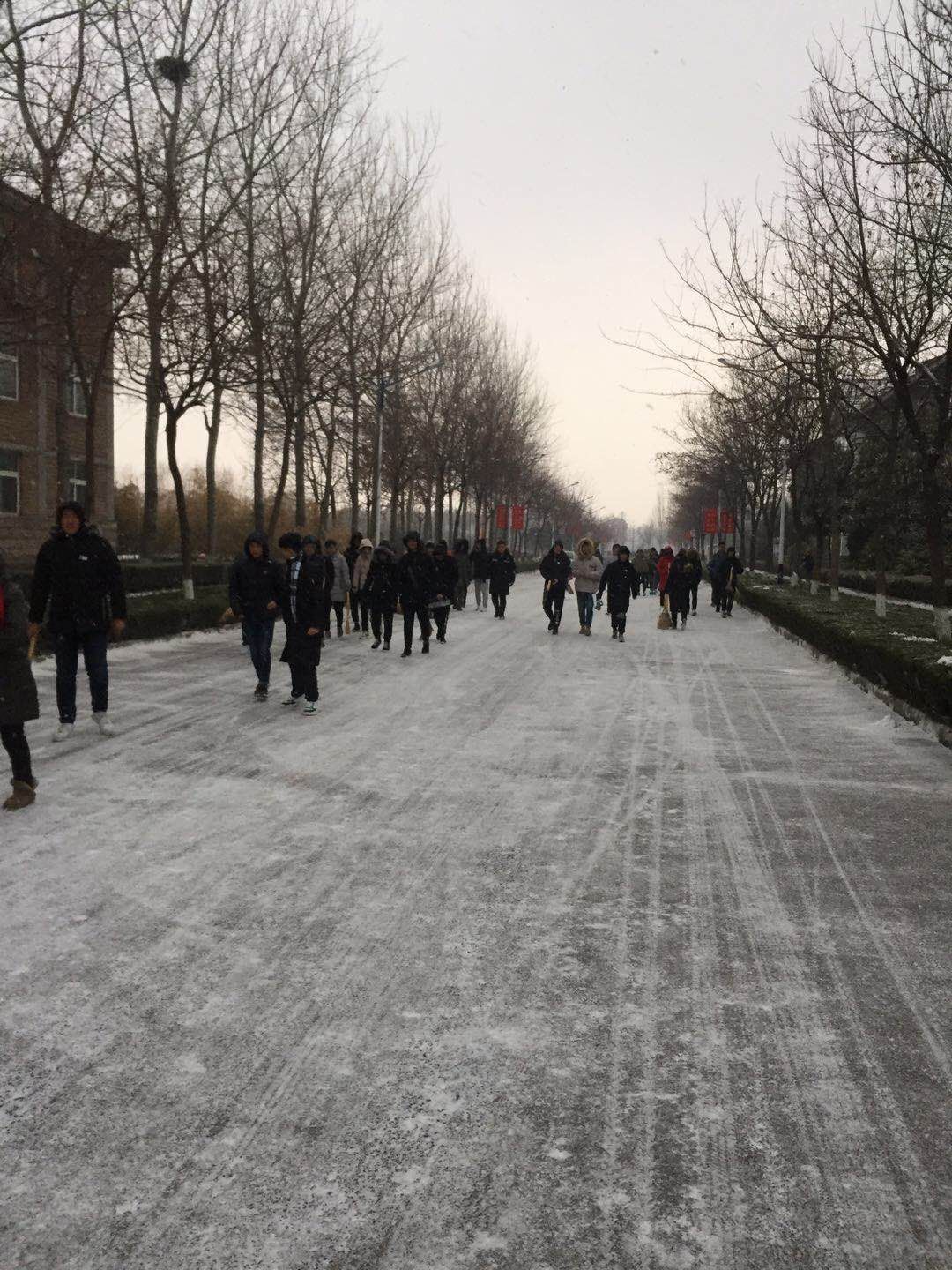 虽然寒风凛冽,但同学们不畏严寒,干劲十足,从早上6时开始,经过一个多小时的努力,基本上铲除了各公寓楼道路、各教学楼路口、办公楼周边、餐厅进出口等道路的积雪,确保了师生的安全出行。学生干部的责任心、担当精神得到师生们的赞誉,纷纷停下脚步为扫雪大军“点赞”。