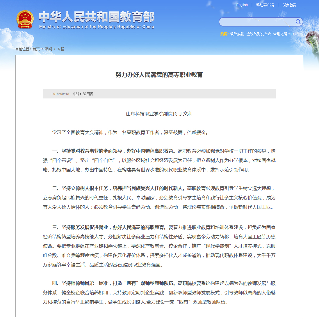 丁文利发言摘编被教育部网站刊发