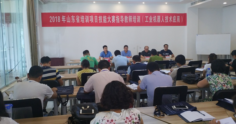 2018年8月2日上午,2018年度山东省培训项目技能大赛指导教师培训(工业机器人技术应用)项目在我院顺利开班,本次省培项目由我院机电工程系承办。学院副院长丁文利出席开班仪式并讲话,机电工程系主任王晓卫主持仪式,江苏省先进机器人技术重点实验室副主任、教育部“工业机器人技术”专业教学标准起草组副组长王振华、山东科技职业学院工业机器人技术专业主任王守顺及来自13所院校的24名优秀青年教师参加了开班仪式。