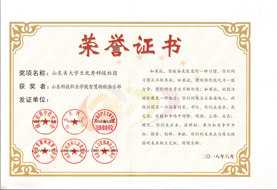 2018年6月,经过层层选拔和评审,我院信息工程系智慧物联俱乐部荣获“山东省优秀大学生科技社团”荣誉称号,智慧物联俱乐部负责人伊现恩同学荣获“山东省大学生优秀科技社团干部”称号。