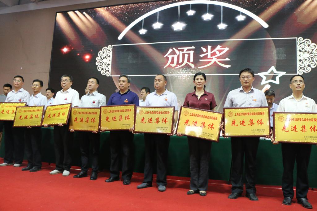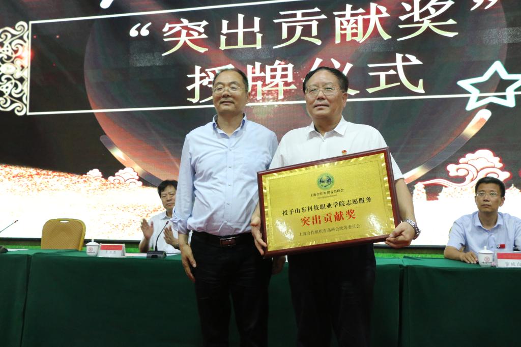 孙夕海代表上海合作组织青岛峰会统筹委员会向学院授志愿服务“突出贡献奖”奖牌,并发表热情洋溢的讲话,他对山东科技职业学院及其志愿者的辛勤付出和无私奉献给予高度评价,对学院的人才培养模式给予高度赞扬,期盼与学院再次合作;胡伟老师和孙国亮同学分别代表教师志愿者和学生志愿者作了发言。
