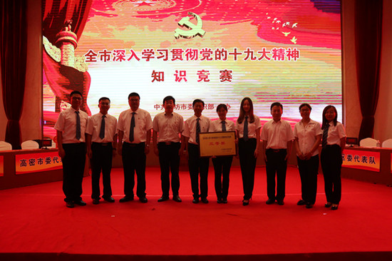 5月25日上午,市委组织部在潍坊东方大酒店A座三楼金色大厅举办全市深入学习贯彻党的十九大精神知识竞赛。学院党委对本次知识竞赛高度重视,组织了校内初赛选拔与集中学习辅导,确定由我院教师党员付海涛、夏青、瞿德文等同志组成竞赛队伍参加本次竞赛,取得第六名、三等奖的好成绩。