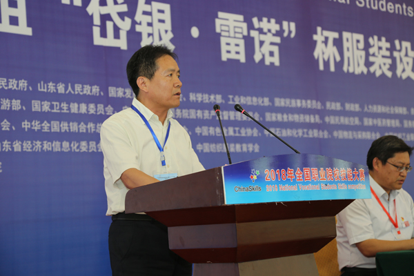 山东岱银纺织服装集团副总经理张广闻在仪式上致辞。他讲到,通过本次大赛,激发服装专业学生学习热情,提升其综合素养和技术技能水平,为培养服装设计与工艺方面的创新型人才贡献力量,真正将“中国制造”变为“中国创造”。