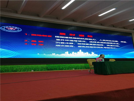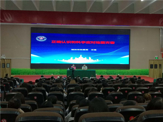 讲座首先围绕地震的基本概念、地震的活动情况、地震监测预报、地震灾害及预报,如何在地震中开展自救互救以及如何做好地震应急工作等专业知识,并结合潍坊市所处地理位置和历史上发生的地震情况,国内5.12汶川大地震及国外智利、日本等国家发生的大地震逐步展开,着重强调了震前、震时和震后各种注意事项,震时避险要因地制宜、果断有序,提醒师生一旦遇到地震应牢记“不要惊慌、伏而待定和定后转移”三大应急原则。