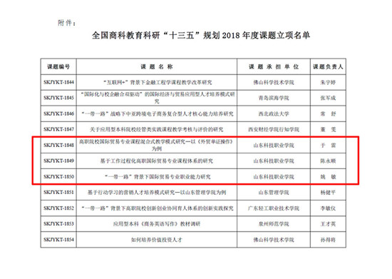 日前,全国商科教育科研“十三五”规划2018年度课题立项名单公布,我院经济管理系陈永顺教授主持申报的《基于工作过程化高职国际贸易专业课程体系的研究》、姚敏副教授主持申报的《“一带一路””背景下国际贸易专业职业能力研究》、于雷老师主持申报的《高职院校国际贸易专业课程混合式教学模式研究—以〈外贸单证操作〉为例》三项课题获准立项。全国商科教育科研课题是由商务部和中国贸促会设立的面向商科类专业人才培养和教育教学改革研究的专项课题,本次全国共有90项课题获准立项,我院一举获得三项。