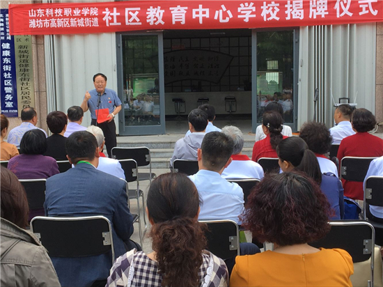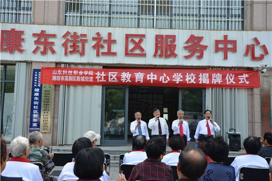揭牌仪式上,刘桂玉首先代表学院讲话,简要介绍了我院的历史沿革、从示范高职到优质院校的发展历程,简述了我院在发展战略、办学特色以及 “五位一体”的人才培养体系,重点介绍了学院在产教融合、校企合作及服务区域经济发展与建设方面的贡献。他指出,学院希望以社区教育中心学校为载体,将优质资源整合利用,促进社会经济和街道文化繁荣发展,为构建区域终身教育体系、建设学习型社会,满足人民群众学习需求做出积极贡献。