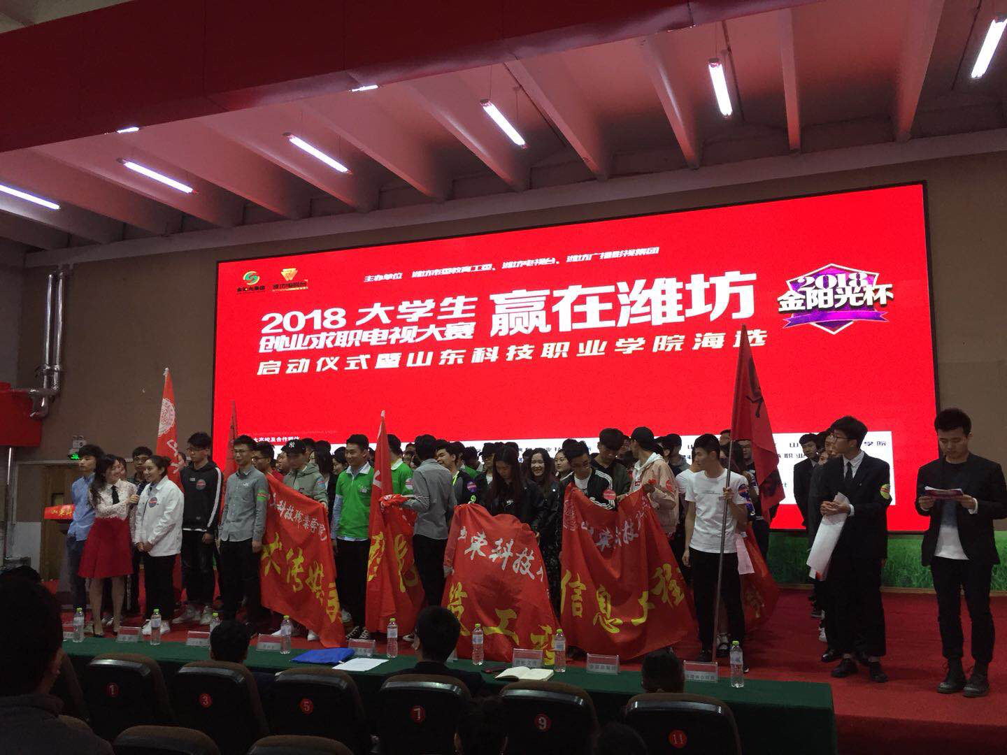 4月18日,赢在潍坊2018大学生创业求职电视大赛启动仪式暨山东科技职业学院海选仪式在我院隆重举行。本次活动由潍坊市委教育工委、潍坊市电视台、潍坊市广播影视集团共同主办,我院承办,学生工作处、招生就业处、产业管理处(创新创业中心)负责具体实施。副院长王永智出席仪式并致辞。潍坊电视台杨敏总监、学生工作处高洪荣处长、招生就业处郑德明处长及各赞助单位负责人参加了本次活动。