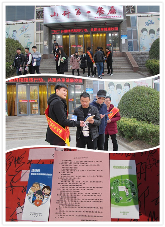 2018年3月24日是第23个“世界防治结核病日”。为认真贯彻落实党的十九大精神和推进健康中国建设的总体要求,进一步提高社会、公众及全院师生对结核病危害性的认识,积极预防结核病,3月23日上午总务处联合学院办公室、学生工作处、教学中心等部门在学院第一餐厅西门举办结核病防治系列宣传活动,潍城区疾控中心结防科主任徐向东一行4人来我院指导工作。