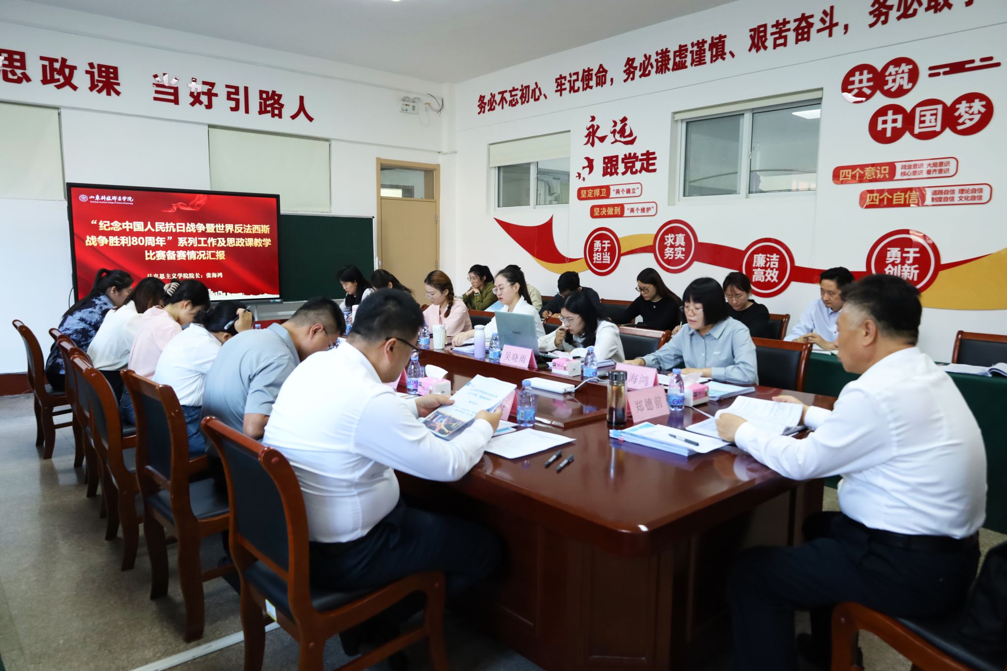 会议伊始,马克思主义学院负责人从“以史铸魂,融学于践”和“聚焦赛事,精准发力”两大方面,详细汇报了部门推进纪念中国人民抗日战争暨世界反法西斯战争胜利80周年系列工作,以及第四届全国高校思政课教学展示活动、山东高校思想政治理论课“萌新磨课会”两项赛事的备赛进展。她表示,部门将以“时不我待”的紧迫感,稳步推进各项工作,力争在推动教学改革创新与教师教学能力提升方面实现双突破。