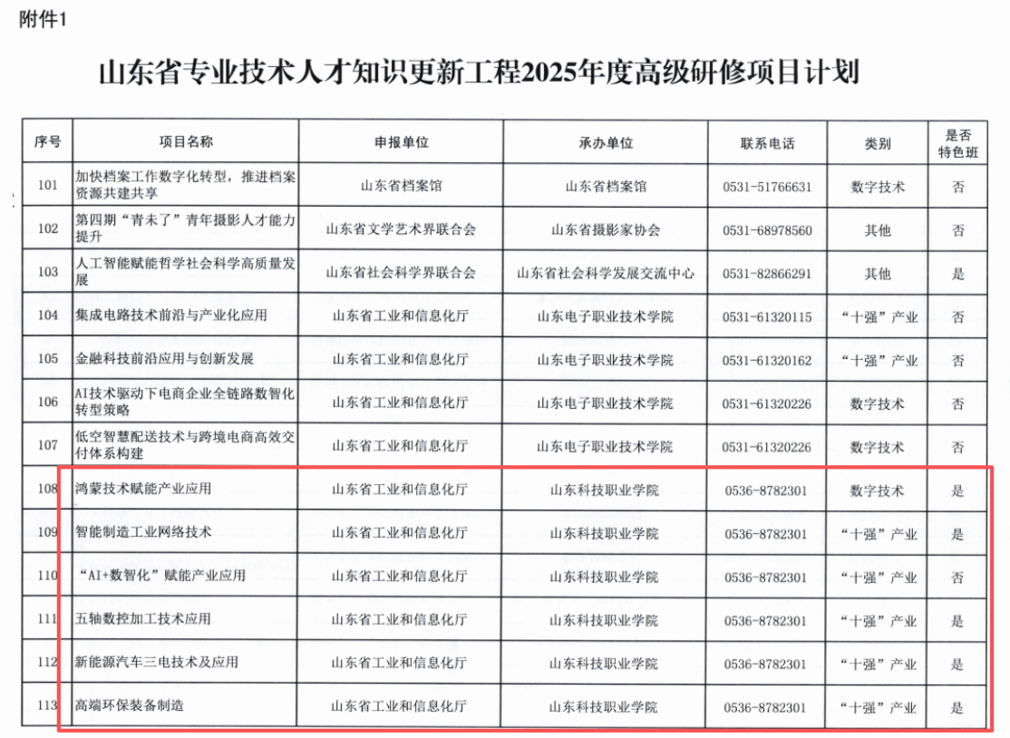近日,从山东省人力资源和社会保障厅传来喜讯,学校申报的“鸿蒙技术赋能产业应用”等6个项目成功入选山东省专业技术人才知识更新工程2025年度高级研修项目计划,成为本次入选项目数量最多的单位,彰显了我校在专业技术人才培养领域的实力与行业认可度。