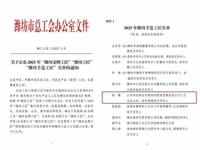 近日,潍坊市总工会公布了2025年“潍坊金牌工匠”“潍坊工匠”“潍坊手造工匠”名单,学校纺织服装系苑敏获评“潍坊手造工匠”荣誉称号。