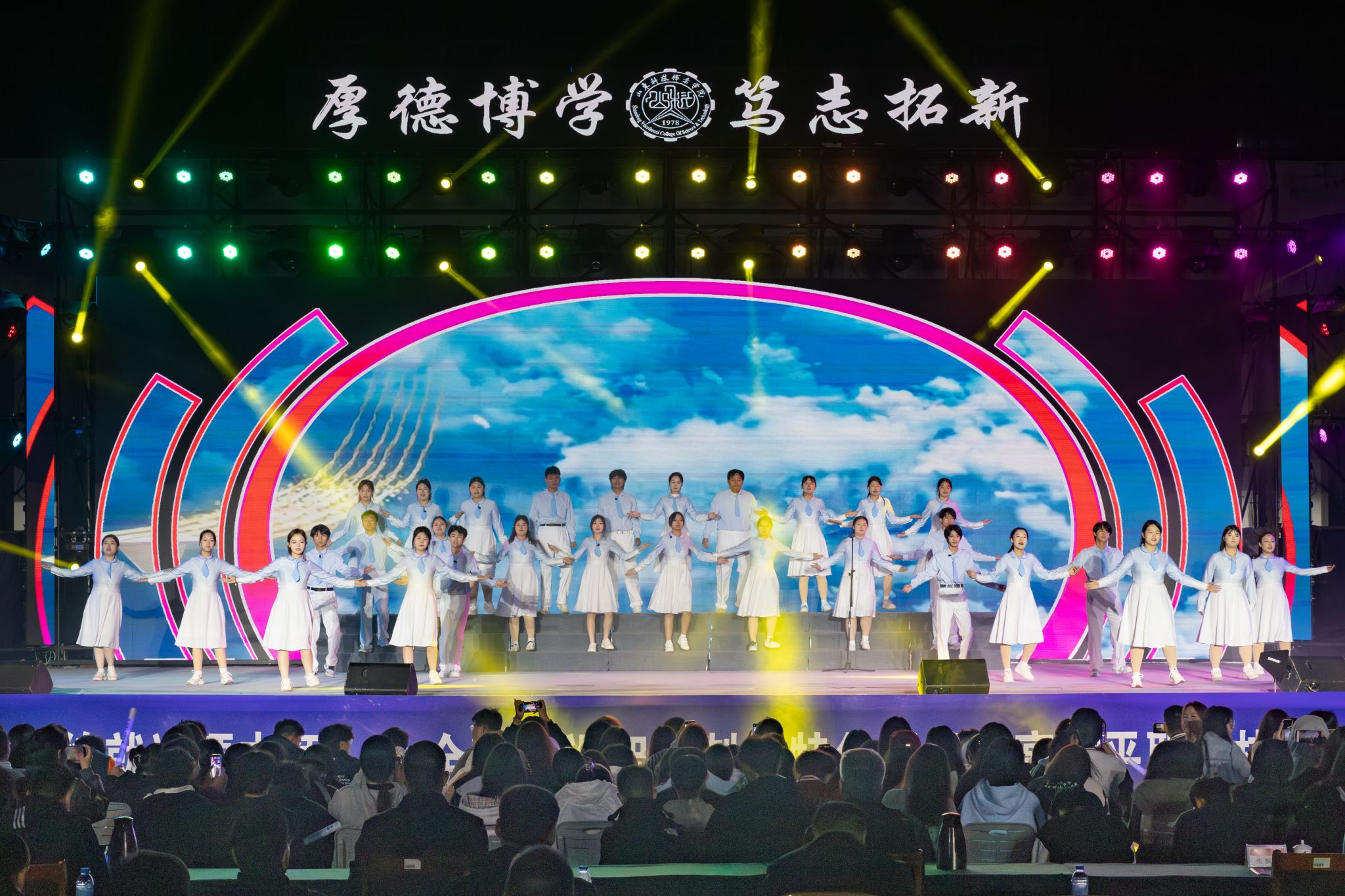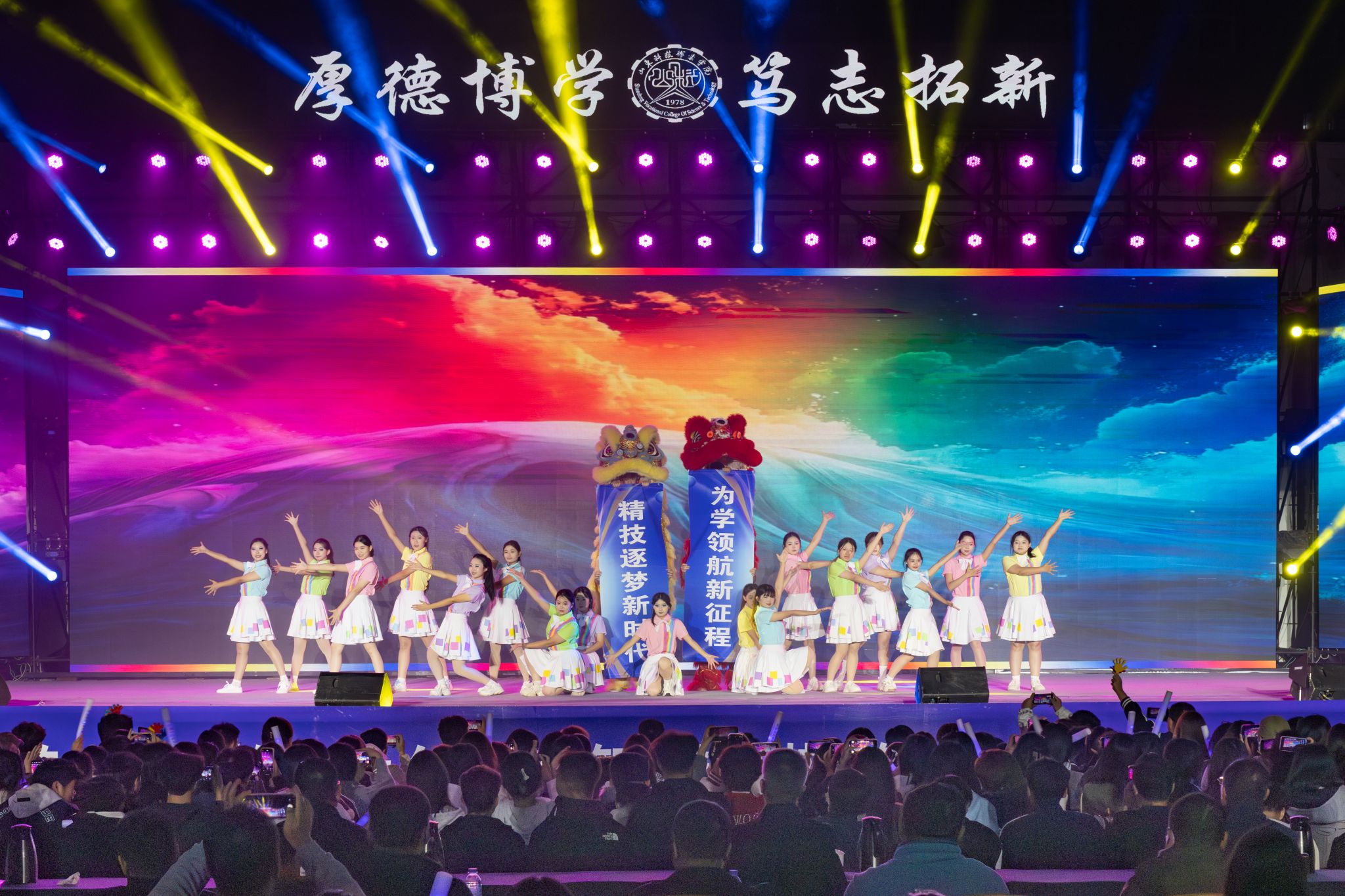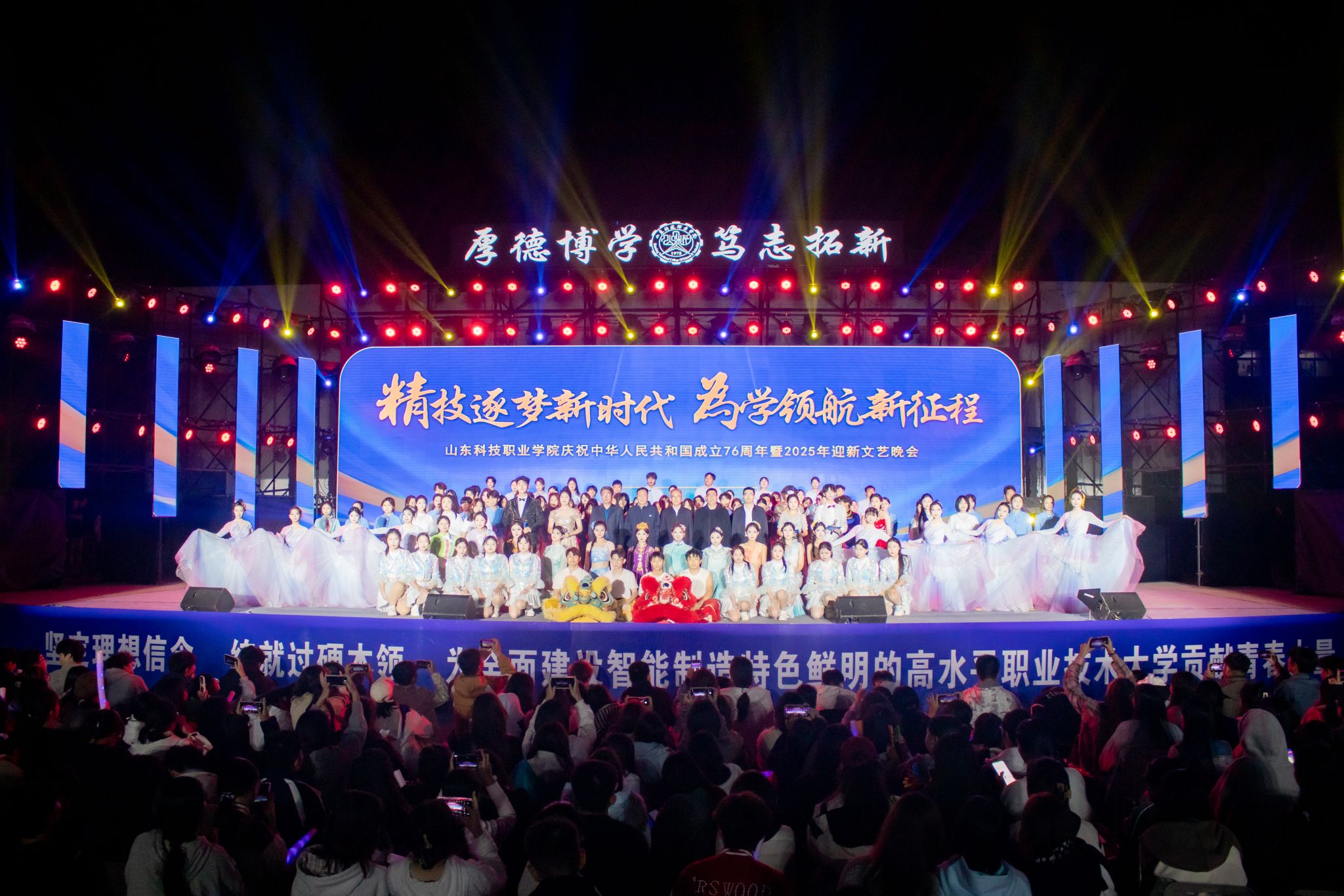 10月16日晚,学校“精技逐梦新时代 为学领航新征程”庆祝中华人民共和国成立76周年暨2025年迎新文艺晚会在精艺广场举办。学校领导班子成员,相关职能部门负责人、各系部党政负责人、辅导员及2025级全体新生和学生代表约7000人欢聚一堂,共赴青春盛会。