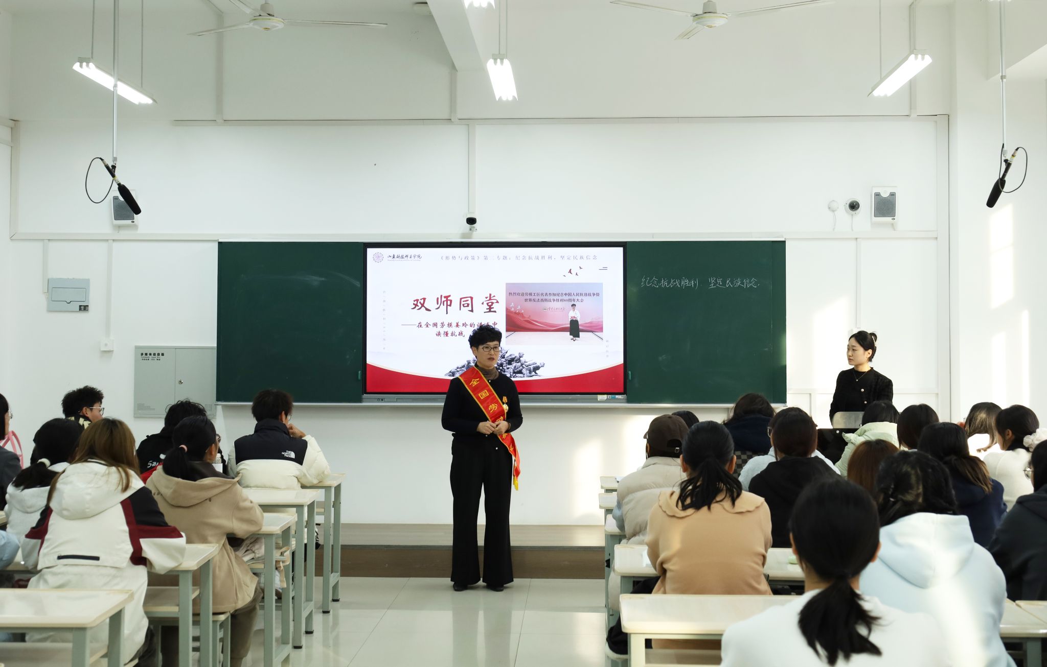 第二阶段:“德技并修・信念铸魂”双师课堂。姜玲女士走进课堂,与马克思主义学院侯亚茹老师共同讲授形势与政策课“纪念抗战胜利 坚定民族信念”专题。侯亚茹老师以时间为轴,带领学生重温抗日战争时期中华民族浴血奋战的峥嵘岁月,深入解读抗战精神内核,引导学生从历史中汲取精神力量。姜玲女士则结合自身受邀参加中国人民抗日战争暨世界反法西斯战争胜利80周年大会的经历进行分享。当受阅方阵驶过,她真切感受到祖国的强大实力与蓬勃发展的强劲脉搏,她将这份震撼同“郝建秀小组”的光辉历程紧密串联——“郝建秀小组”在建国之初便响应时代号召,以“增产节约、为国增富”的坚定信念投身工业建设,用实干担当为国家工业崛起筑牢根基。姜玲女士通过个人经历与行业故事,向学生传递出“爱国需落于实处”的理念——产业工人以精进技艺诠释忠诚;青年学子应凭扎实学识锤炼过硬本领,为国家发展注入青春动能。