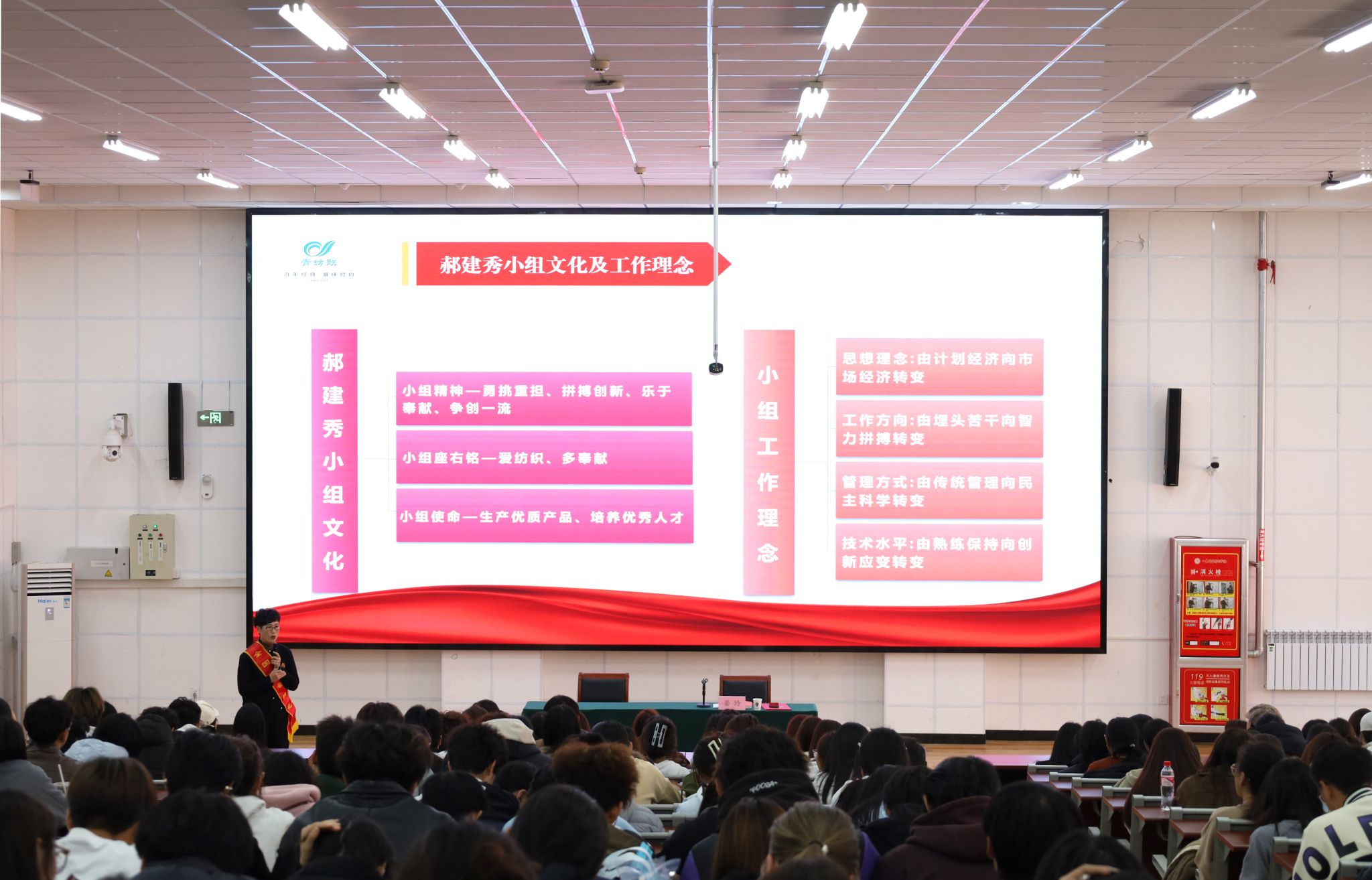 本次活动分两个阶段,第一阶段:“匠心传承・精神领航”专题宣讲。深耕纺织行业35载的姜玲女士以“永远发挥火车头的作用”为主线,带领师生深入探寻“郝建秀小组”73年的奋进历程与精神密码。从初入岗位时钻研“郝建秀工作法”的执着坚守,到担任组长后带领团队突破传统纺织业转型瓶颈的创新担当,她用自身成长轨迹诠释出产业工人的匠心本色。“郝建秀小组”自成立以来,始终保持100%出勤率,以全员在岗的坚守诠释责任;同时秉持“以人为本”理念,通过“四会四访”机制密切关心员工工作与生活,凝聚起强大团队合力。一代代组员传承着“勇挑重担、拼搏创新、乐于奉献、争创一流”的火车头精神,以行业火车头的姿态引领纺织产业发展。“火车头精神”的核心,是立足平凡岗位、雕琢极致品质的坚守,更是将个人奋斗融入国家发展洪流的使命担当,为在场师生点亮了以匠心守初心的精神灯塔。