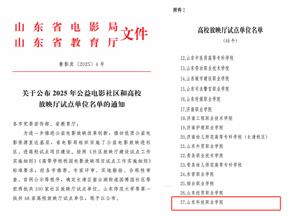 近日,山东省电影局与山东省教育厅联合印发《关于公布2025年公益电影社区和高校放映厅试点单位名单的通知》,确定首批社区放映厅试点单位和高校放映厅试点单位,学校入选高校放映厅试点单位名单。