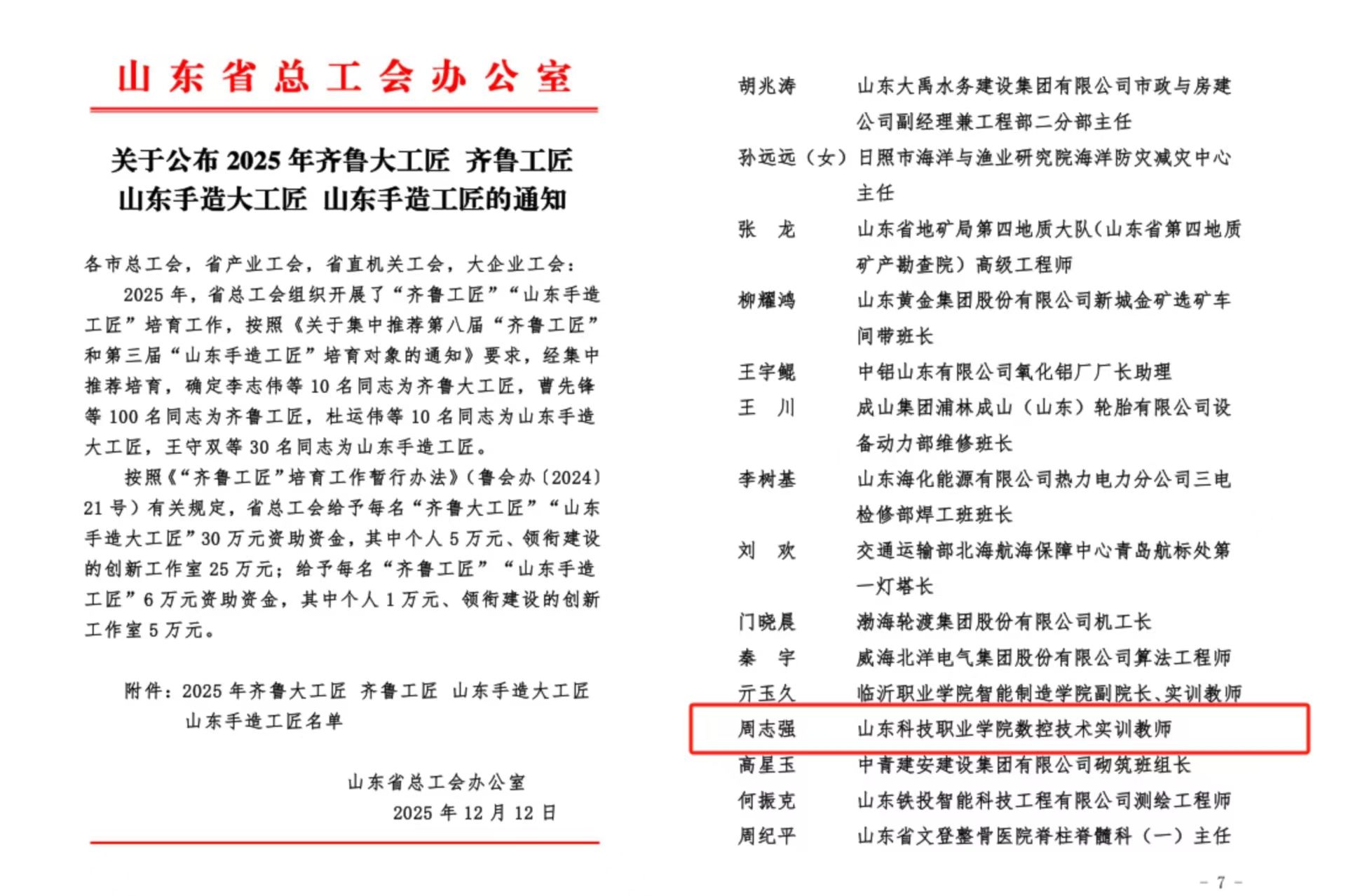 近日,山东省总工会公布了2025年齐鲁大工匠、齐鲁工匠、山东手造大工匠及山东手造工匠名单,学校机械工程系周志强成功入选“齐鲁工匠”,成为全省100名获此殊荣的技能人才之一。