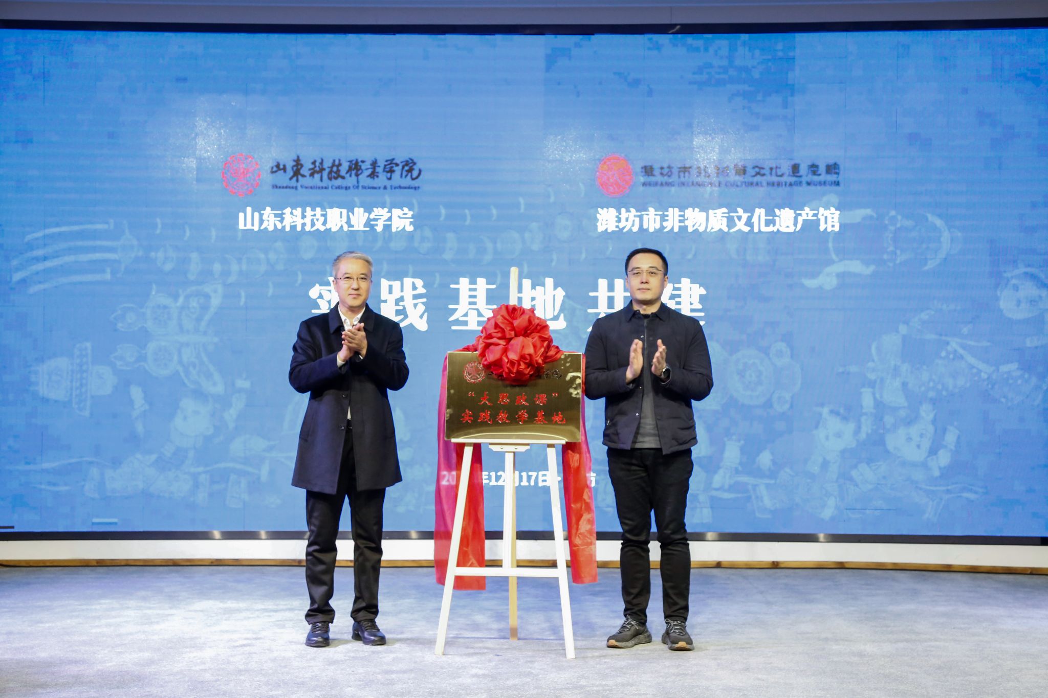 马克思主义学院院长与潍坊市非物质文化遗产馆馆长签署共建协议。秦建坤与李义龙为“大思政课”实践教学基地揭牌。经济管理系党总支书记、潍坊市非物质文化遗产馆馆长为非遗传承教育基地、大学生社会实践基地揭牌。