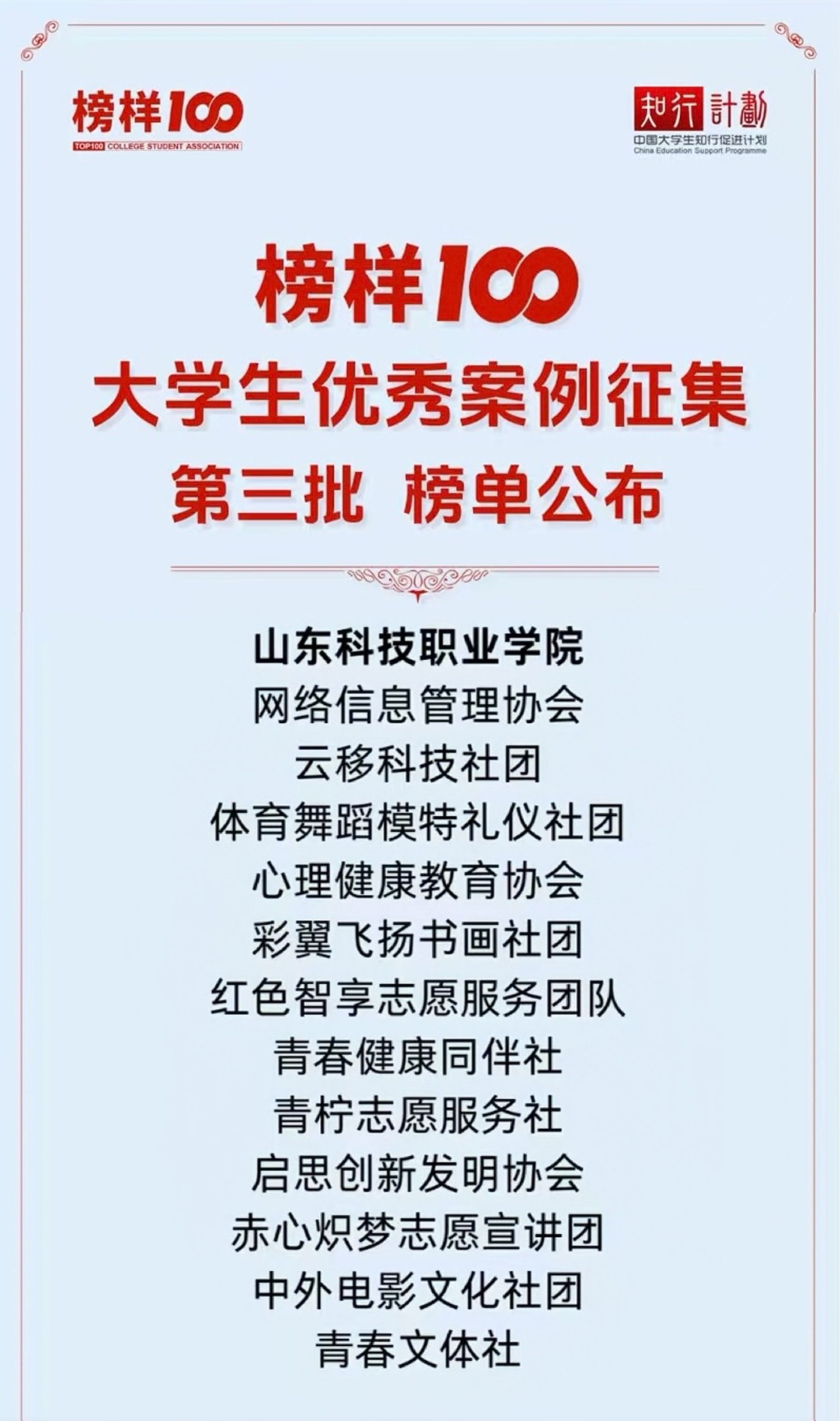 近日,“中国大学生社会实践知行促进计划”(简称“知行计划”)正式公布2025“榜样100”大学生优秀案例,学校网络信息管理协会、云移科技社团、体育舞蹈模特礼仪社团、心理健康教育协会、彩翼飞扬书画社团、红色智享志愿服务团队、青春健康同伴社、青柠志愿服务社、启思创新发明协会、赤心炽梦志愿宣讲团、中外电影文化社团、青春文体社等12个学生社团凭借在社会实践、专业创新、志愿服务等领域的卓越表现成功入选,用青春实绩彰显了新时代大学生的责任与担当。