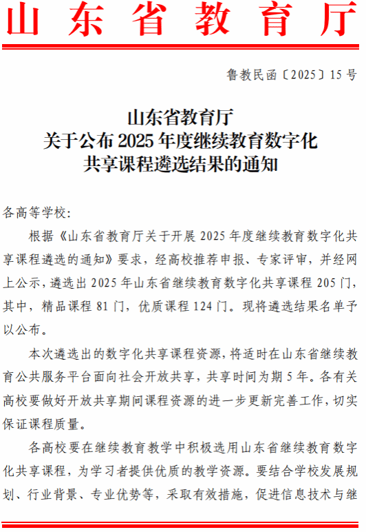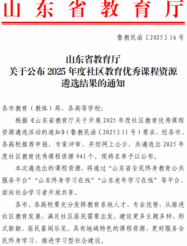 近日,2025年度省级继续教育数字化共享课程、社区教育优秀课程、专业技术人员继续教育优质在线公需课评选结果陆续揭晓。我校申报课程表现突出,三类课程共有16门课程成功入选,展现了学校在继续教育数字化建设方面的显著成果。
