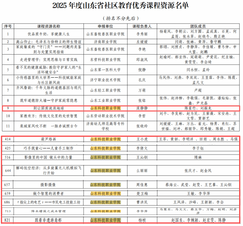 《影视制作与特效合成》等3门课程获评“山东省继续教育数字化共享课程”;《别让固废流浪地球》等10门课程获评“山东省社区教育优秀课程”;《穿越千年的对话:遇见孔子与老子》等2门课程获评山东省专业技术人员继续教育优质在线公需课,《建设社会主义生态文明》获评山东省专业技术人员继续教育最具人气在线公需课,学校同时获“优秀组织单位”。