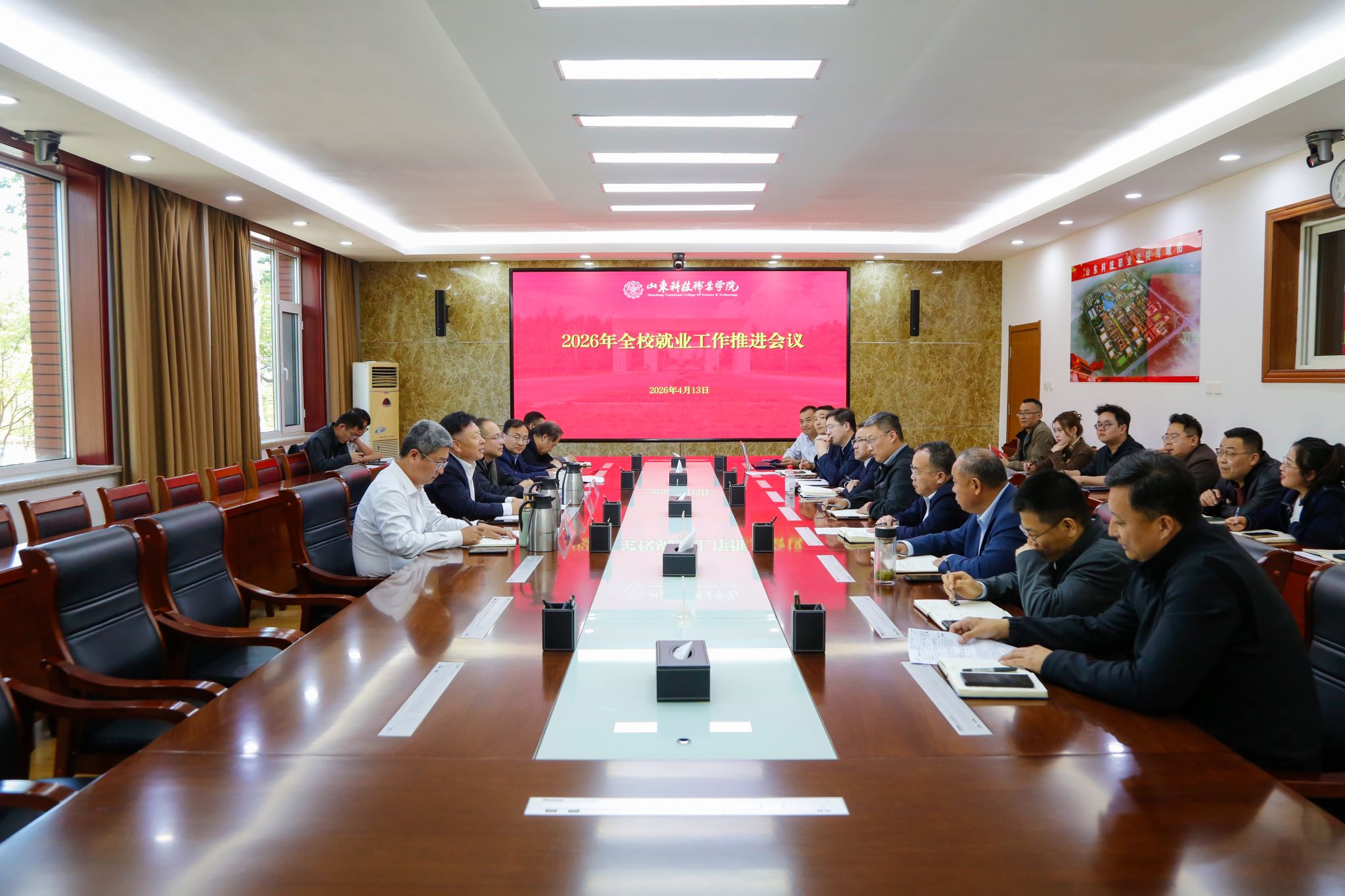 为深入贯彻落实党中央、国务院关于做好高校毕业生就业工作的决策部署,落实山东省2026届高校毕业生就业工作方案总体要求,抢抓春季促就业工作关键期,加大力度推进2026届毕业生就业工作,4月13日,2026年全校就业工作推进会议在学校第一会议室召开。党委书记郑德前出席会议并讲话,副校长张振东主持会议,招生就业处负责人及相关人员,各系部党总支书记、就业工作负责人参加会议。