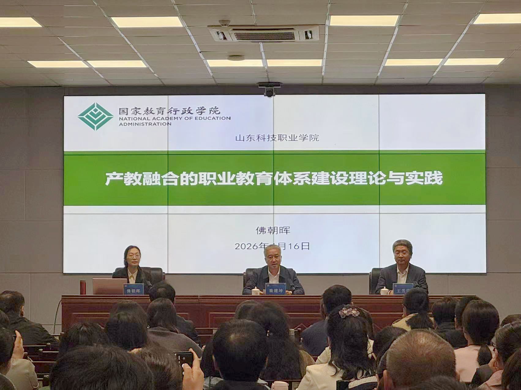 为深入贯彻产教融合政策精神,准确把握现代职业教育体系建设要求,全面推进教育教学改革,切实提升教师专业素养与育人水平,4月16日下午,学校举办2026年教学改革与发展大讲堂系列培训第一讲,国家教育行政学院职业教育研究中心研究员佛朝晖应邀来校作《产教融合的职业教育体系建设理论与实践》专题讲座。讲座在南院201报告厅举行,校领导、系部主任和副主任、各专业主任和骨干教师100余人参加。学校党委副书记秦建坤主持讲座。