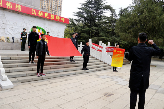 陵园肃穆护忠魂,历史沧桑弘正气。站立在烈士陵园革命烈士纪念碑前,全体人员肃立,满怀崇敬之情,我院导航员向革命烈士敬献花圈,并全体默哀一分钟和弯腰行礼三鞠躬,以寄托对革命烈士的哀思与缅怀之情。默哀结束后,在院学生会主席杨贵超同学的带领下,学生们举起右手,重温了入团誓词。