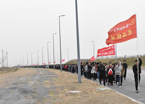 14日早上6:30,同学们集合完毕,广场上班旗飘飘一字排开,庄严郑重的宣誓声响彻天空。宣誓动员大会后,全体学生有序出发,拉练途中同学们意气风发,朝气蓬勃,中午到达美丽宜人的欢乐海沙滩,经过半个小时的就餐、休整后沿壮观的拦海大坝继续前行。历时10余个小时,下午6点参加长途拉练活动的学生和教师全部顺利返校。滨海区央子边防派出所、大学园区治安管理办公室、滨海县交警队、央子中医院急救中心共同对拉练活动进行了全程跟踪保障。整个过程,组织得力,保障到位,秩序井然。