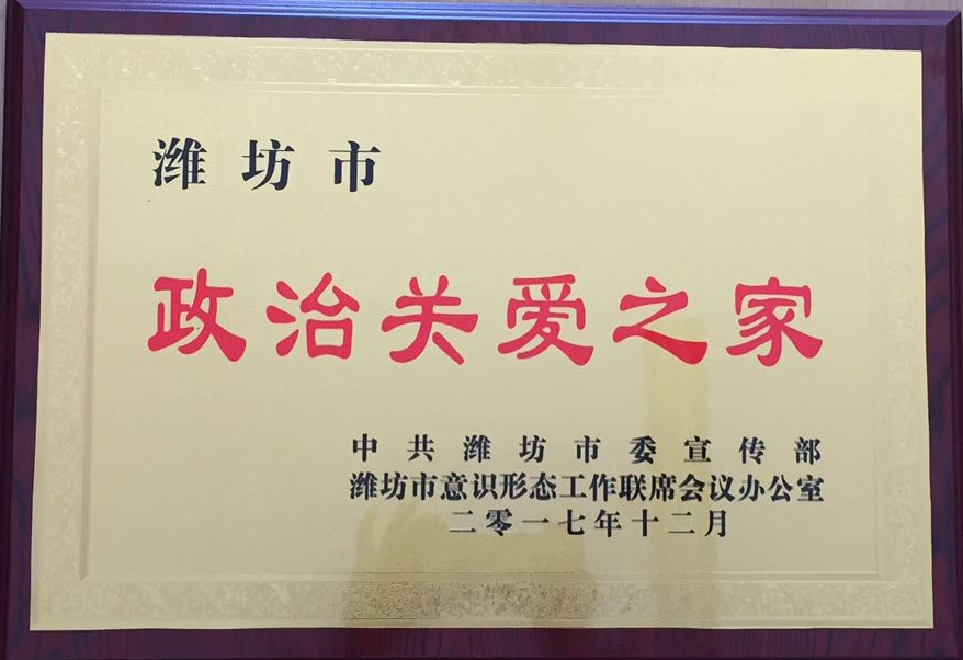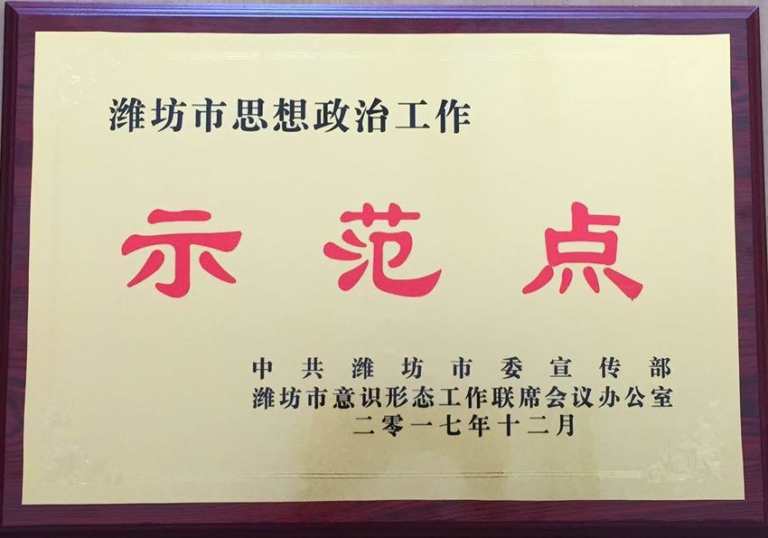 2018年1月25日,中共潍坊市委宣传部、潍坊市意识形态工作联席会议办公室联合下发《关于公布潍坊市思想政治工作示范点和政治关爱之家的通知》(潍宣办字〔2018〕4号)文件,我院荣获“潍坊市思想政治工作示范点”和“潍坊市政治关爱之家”称号,这是我院在思想政治工作与文化宣传方面荣获的又一重要荣誉。