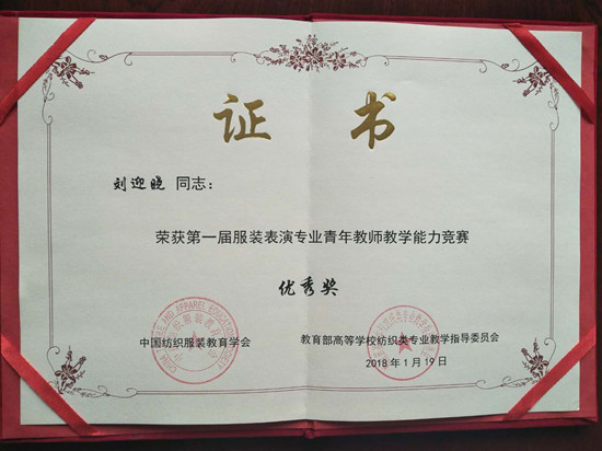 由中国纺织服装教育学会、教育部高等学校纺织类专业教学指导委员会主办、华南农业大学艺术学院承办的第一届服装表演专业青年教师教学能力竞赛于2018年1月19日结束。我院纺织服装系教师刘迎晓报名参加了此次比赛,通过网评和会议评选两个环节竞赛,最终获得优秀奖。