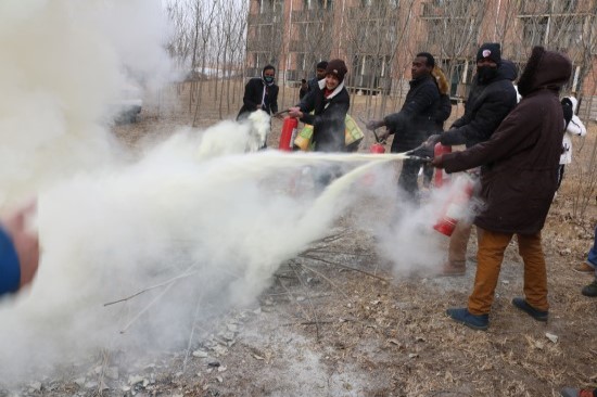 宋林书在留学生安全教育讲座中重点介绍了消防、交通安全注意事项、火场逃生原则、自救方法和遵守中国法律、宗教信仰、外出旅游安全、课外活动和假期生活、防盗窃等安全知识。随后,留学生在24号公寓一楼大厅和户外举行了消防演练活动。安全保卫处刘风林老师为留学生详细讲解了火场逃生方法和注意事项,并亲自演示了灭火器和消防栓的使用方法。活动现场,留学生听到哨声后,用毛巾捂住口鼻迅速从各自房间撤离到一楼大厅。最后,留学生在24号楼户外开展灭火演练,掌握了灭火器的使用方法和要领。