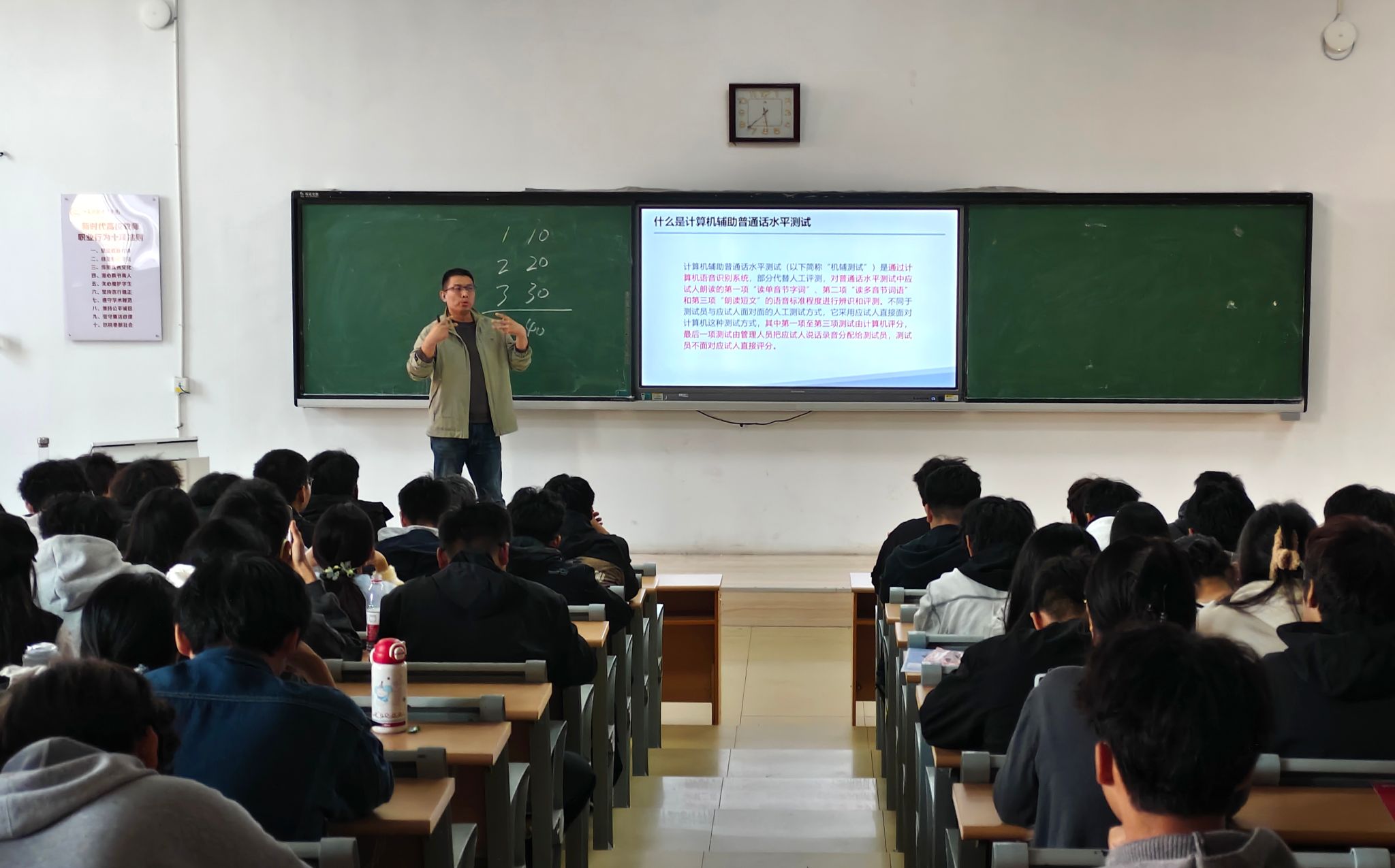 11月5日下午,为助力学生提升普通话水平、明晰考试流程,机械工程系在博学楼C102教室开展普通话考试培训活动。本次活动由基础部劳鸿鹏老师担任主讲,机械工程系两百多名学生参与学习培训,通过理论与实践相结合的模式系统指导参训同学提升普通话发音规范及语言表达能力。