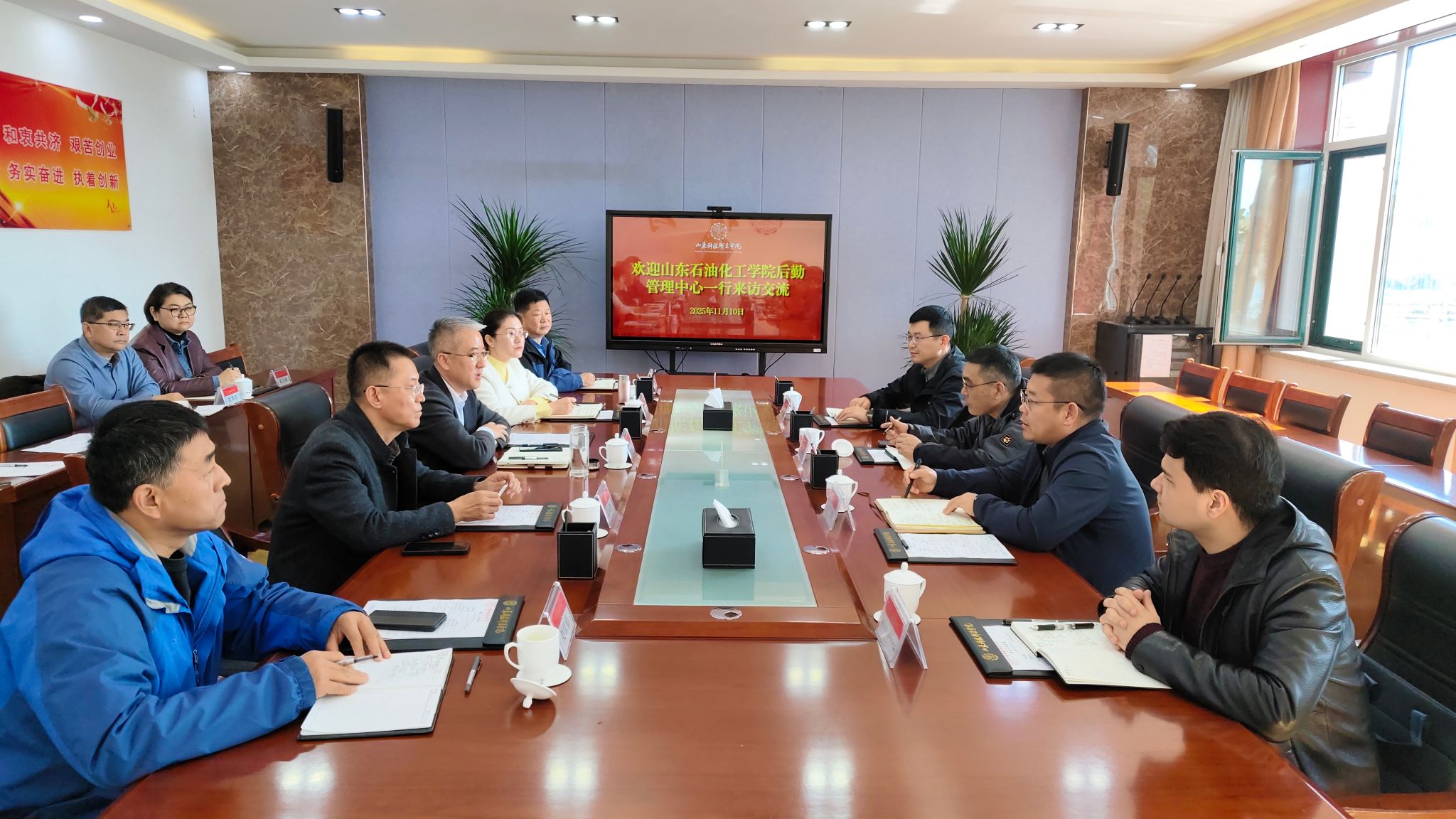 11月10日上午,山东石油化工学院后勤管理中心主任祝永胜率队一行5人到访我校,学校党委副书记秦建坤会见来宾并进行座谈交流,后勤服务管理处主要负责同志参加。
