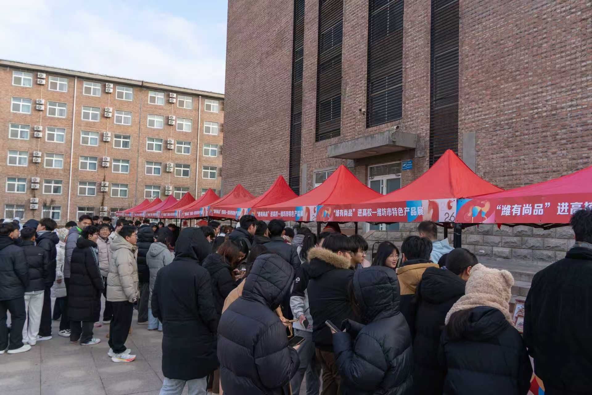 展销期间,广场上人头攒动,气氛热烈。同学们在各个展位前流连忘返,品尝潍坊特色美食,选购心仪的年货礼品,亲身感受潍坊本土文化的魅力。许多同学表示,此类活动不仅让大家在校内就能买到正宗潍坊好品,更增强了对潍坊地域文化的认同感和归属感。