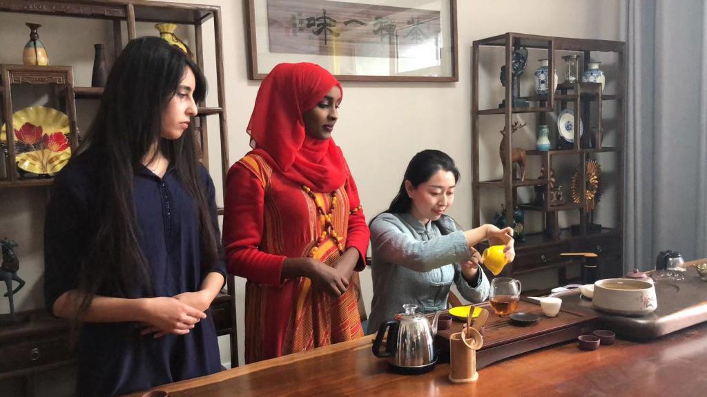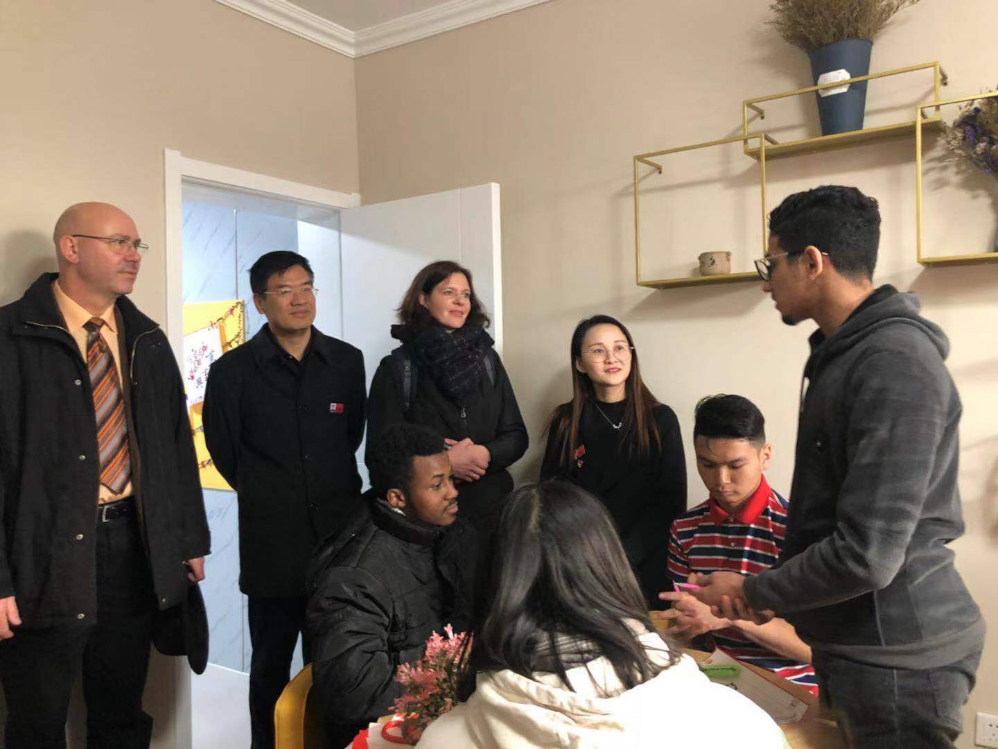 随后杜德施塔特职业学校副校长施密特一行参观了我院的留学生公寓,了解我院留学生的住宿生活情况,并表示赞赏。在留学生文化体验室,与留学生一起赏茶、品茶,并为中国茶道、茶德、茶艺等丰富的茶文化赞叹不已。