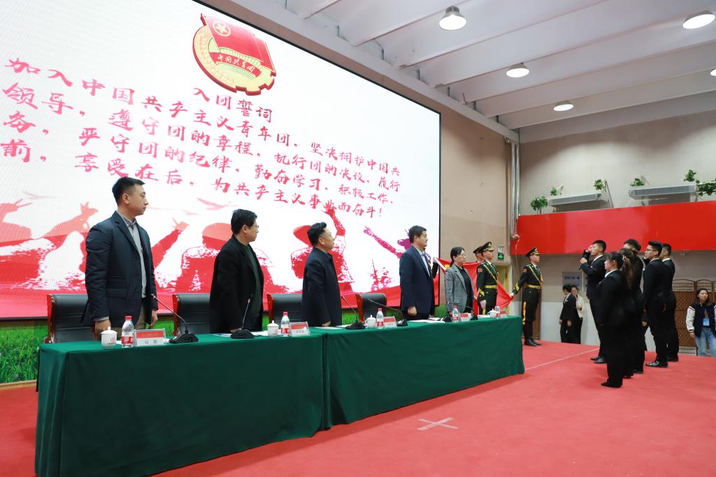 会议宣读了《山东科技职业学院团校实施方案》,5名新团员进行了入团宣誓,参会领导为新团员佩戴团徽。最后,伴随着激昂的旋律,全体人员唱起了共青团团歌《光荣啊,中国共青团!》,嘹亮的歌声在会场回荡,表明了共青团员、团干部做好共青团工作的信心和决心。