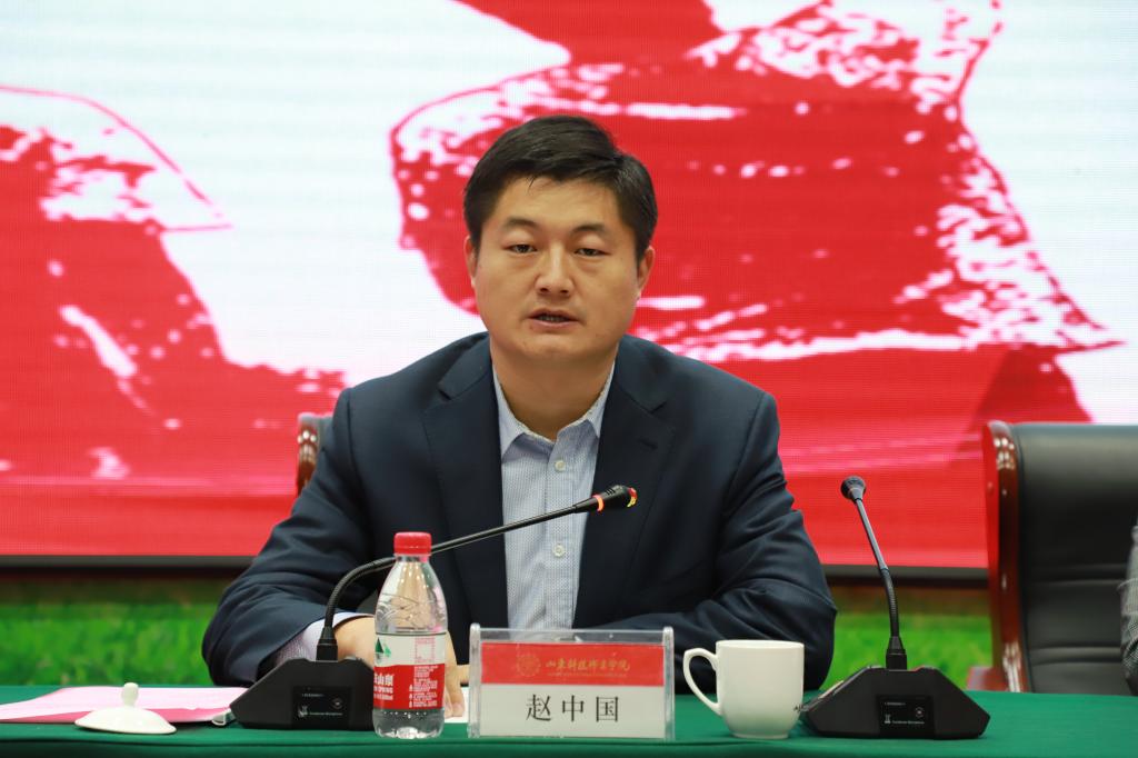 赵中国同志发表讲话,他指出,山东科技职业学院团校的成立,是学校共青团工作的一件大事,是落实团中央高校共青团改革实施意见、加强对青年学生思想政治引领的实际行动,很有意义。希望学院各级团组织牢固树立“全局、政治、开放”三个理念,充分发挥职能作用,进一步建好、管好、用好这一团组织培训教育阵地,努力为建设现代化高品质城市做好人才储备。赵中国送给各级团组织和广大团员青年“三句话”,一是“少年心事当拏云”,希望团员青年在坚定理想信念上走在前列,带头坚定跟党走中国特色社会主义道路的信念,以国家富强、人民幸福为己任,把实现个人理想与国家前途命运紧密结合起来,为实现中华民族伟大复兴的中国梦而不懈奋斗。二是“书山有路勤为径”,希望团员青年在勤奋学习上走在前列。要保持学习热情,提高学习效率,通过学习不断提升素质、增强本领,努力成长为堪当重任的栋梁之材。三是“绝知此事要躬行”,希望团员青年在实践锻炼上走在前列。要勇于到人民群众中去,勇于到基层一线去,勇于到艰苦环境中去,经受锻炼、增长才干,服务奉献社会,在文明城市创建、乡村振兴、双招双引、创新创业、扶贫助困等各个领域发挥更大的作用,为我市经济社会发展贡献青春力量。