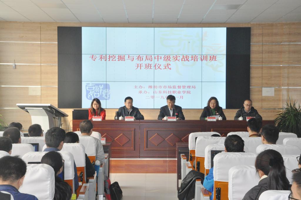 11月16日上午,由潍坊市市场监督管理局主办、山东科技职业学院承办的“2019年专利挖掘与布局中级实战培训班”开班仪式在南院报告厅举行。学院党委委员、副院长王永智,潍坊市市场监督管理局副局长庞胜明出席仪式,学院继续教育与培训中心相关同志,来自潍坊各县市区60余名学员参加了仪式。