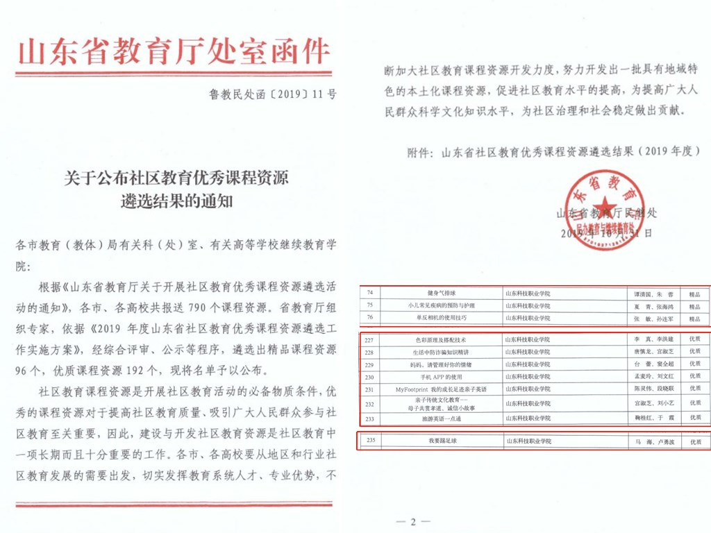 近日,山东省教育厅发布《关于公布社区教育优秀课程资源遴选结果的通知》(鲁教民处函[2019]11号),学院11门课程被评选为2019年度山东省社区教育优秀课程资源。其中继续教育与培训中心张敏《单反相机的使用技巧》、基础部(思政部)谭清国《健身气排球》、基础部(思政部)夏青《小儿常见疾病的预防与护理》3门课程认定为精品课程资源,《色彩原理及搭配技术》等8门课程认定为优质课程资源。
