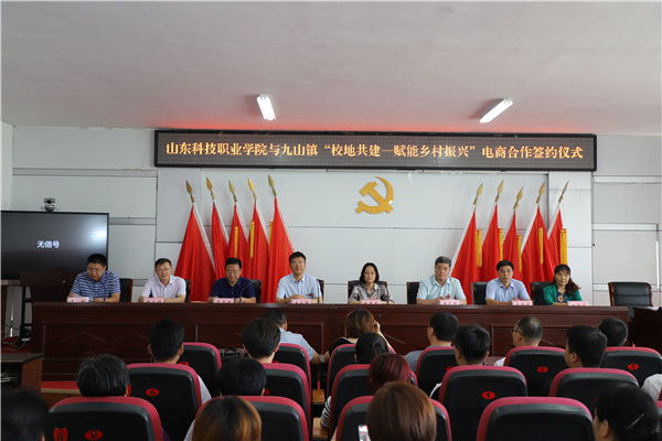 6月27日上午,山东科技职业学院与临朐县九山镇政府 “校地共建——赋能乡村振兴”电商合作签约仪式在九山镇政府举行。临朐县副县长张慧玉、山东科技职业学院副院长王永智、临朐县科技局局长李贤军、九山镇党委书记贺志健、九山镇镇长王楷及经济管理系、产业管理处部门负责人出席了签约仪式。本次校地电商合作涵盖电商提升、精准扶贫、电商培训,创业孵化基地共建等方面内容。上午同时举行了山东科技职业学院青年红色筑梦之旅活动启动仪式,为了强化社会主义核心价值观教育,传承红色革命文化,学院还依托响水崖水库建设纪念馆,建立了山东科技职业学院红色教育基地。