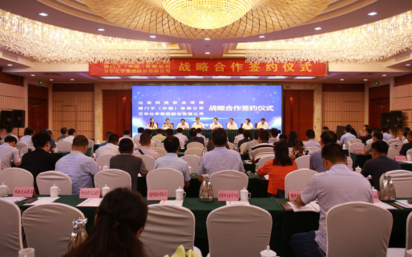 山东科技职业学院党委书记王万杰致辞,他指出,签约仪式标志着山东省智能制造公共实训基地有了更加高端、更加优质的公共服务平台,也标志着学院与万华集团的合作进入了战略合作的新时期,必将进一步增强学院服务山东和区域经济社会发展的能力。今后,学院将继续发挥国家示范性高职院校和全国优质高职院校的示范带头作用,更加坚定自觉地以习近平新时代中国特色社会主义思想为指导,加强与企业的深度融合,为系统培养适应行业企业发展需求的高素质技能型人才,推动我省现代职业教育体系建设,全面增强服务区域经济和山东经济社会发展能力做出积极贡献。