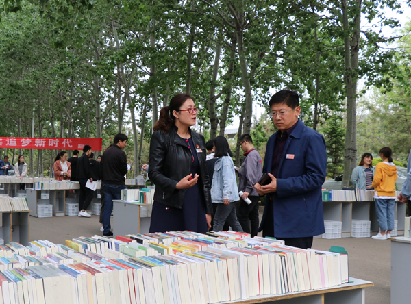 本次展示了文学、经济、历史、工业技术等涵盖24大类的10000余册图书,今年区别以往推荐模式,采取“现选现借”形式即“读者现场选书—登记—现场借阅”,读者挑选自己喜欢的图书后,即可在现场由工作人员对所借图书进行登记后取走借阅,为读者提供了极大地便利。活动现场,读者络绎不绝,李保城到现场挑选了图书,询问了到场读者爱好的图书类别,并鼓励广大师生养成良好的阅读习惯。