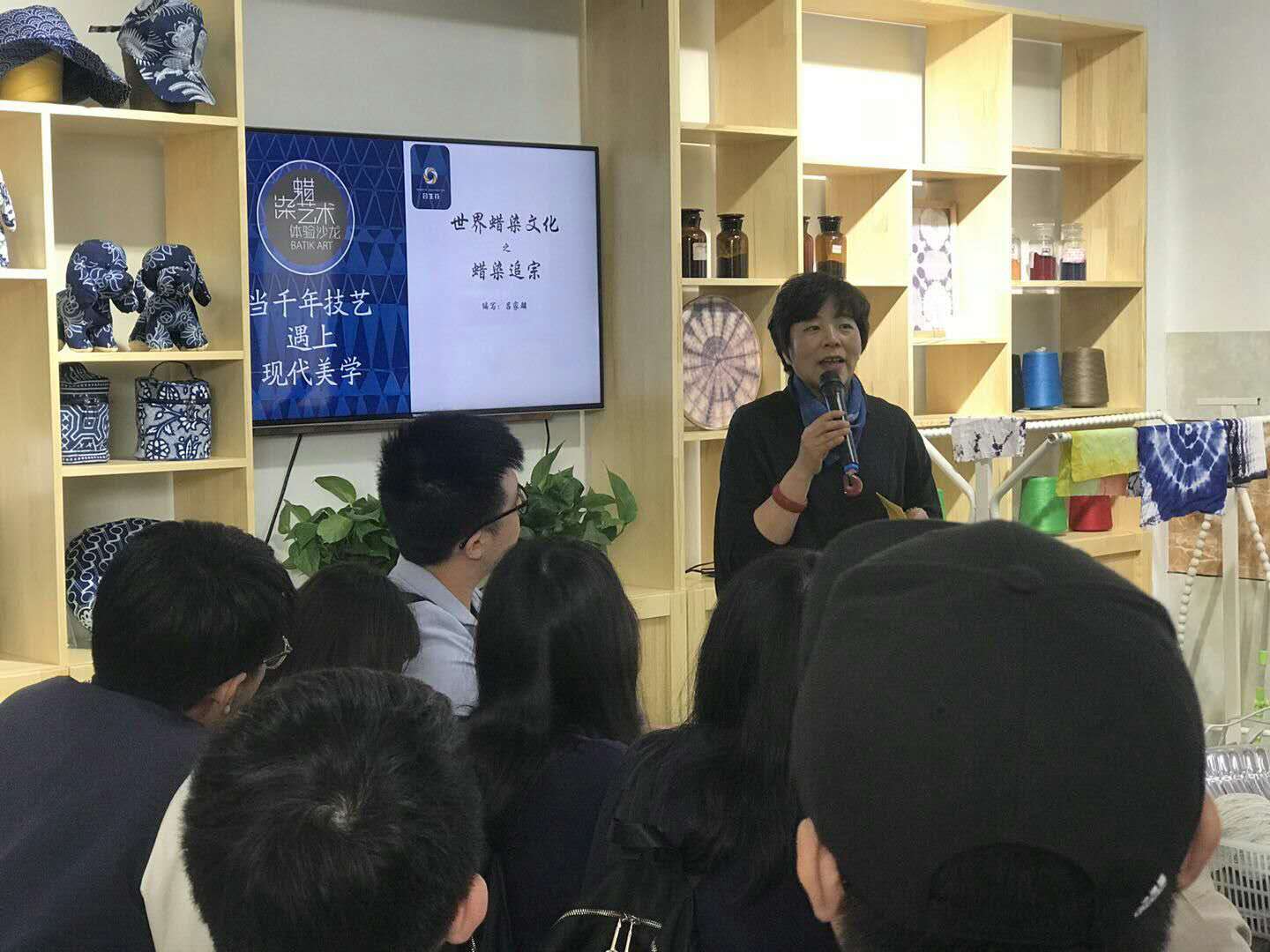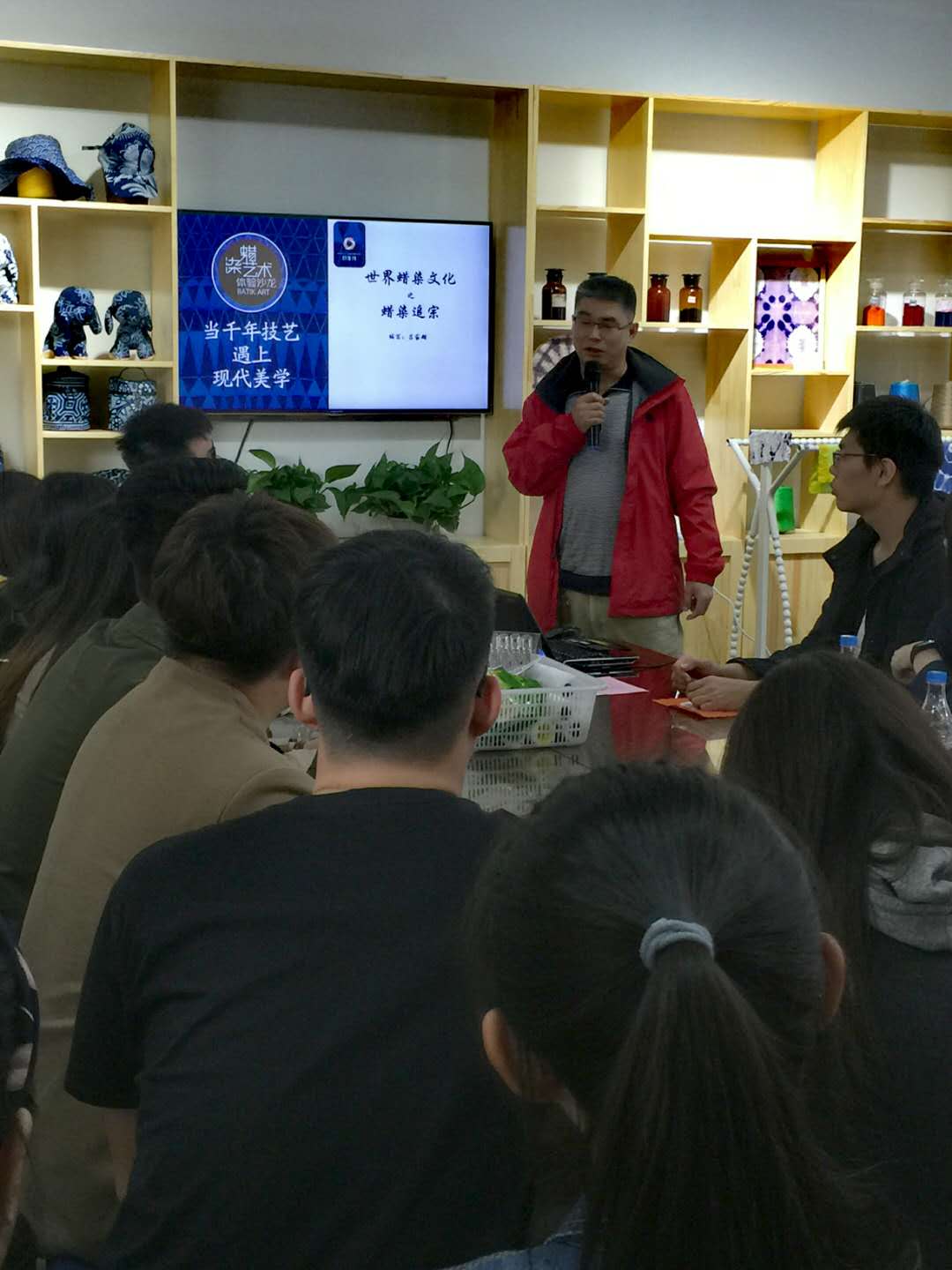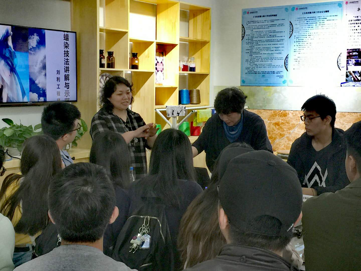 本次授课由昌邑华晨集团吕家麟博士介绍了蜡染的发展历程,再次由昌邑华晨集团工程师刘利老师亲自示范了扎染、蜡染的技法与染色过程,最后同学们都亲自设计动手体验了全过程,每个人的作品都很精彩。