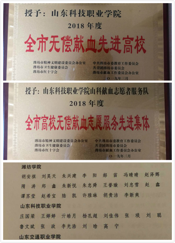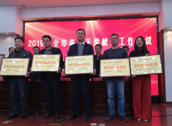 4月2日,潍坊市卫生健康委员会会同潍坊市献血工作委员会办公室、潍坊市精神文明建设委员会办公室、中共潍坊市教育工作委员会、共青团潍坊市委、潍坊市红十字会六个部门联合召开2019年度全市无偿献血工作会议,历时一天时间。会议全面总结2018年度全市无偿献血工作,进一步明确以开展无偿献血,凝聚大爱,奉献社会为工作落脚点,安排部署2019年工作任务。会上表彰了2018年度全市无偿献血工作先进单位、集体和个人,我院在潍坊市2018年度无偿献血工作中,荣获全市无偿献血先进高校荣誉称号,山科献血志愿服务队荣获全市高校无偿献血志愿服务先进集体荣誉称号,庄国良等12名学生干部荣获2018年度全市高校无偿献血志愿服务先进个人荣誉称号。