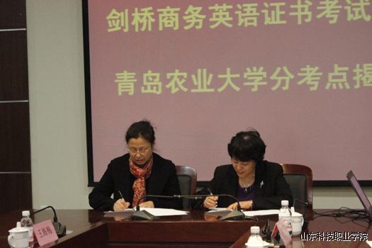 12月19日,我院院长助理孙淑敏、国际商务外语系主任迟尧林等一行赴青岛农业大学举行签约暨揭牌仪式。青岛农业大学副校长杨同毅,外国语学院党委书记孙世孟、院长潘桂荣等出席本次仪式。双方共同表示今后将互相学习、加强合作,本着方便和服务考生、促进外语教学和考试协调发展的原则进一步组织好剑桥商务英语证书(BEC)考试。
