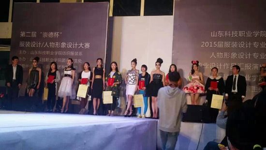 10月25日晚,第二届“崇德杯”服装设计/人物形象设计大赛暨2015届服装设计/人物形象设计专业毕业作品汇报演出,在山东科技职业学院科技创新中心三楼隆重举行。此次活动由纺织服装系主办,团委学生处协办,山东崇德集团有限公司、广州头彩服饰有限公司和山东中柏韩美科技股份有限公司全程赞助,徐建明院长、林勇祥副书记、企业同行以及纺织服装系师生共享时尚盛典。