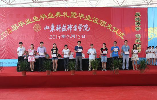 徐建明发表了热情洋溢的讲话,他首先向圆满完成学业的全体毕业生表示热烈的祝贺,同时肯定了2014届毕业生在校期间所取得的优异成绩,并向同学们提出走出校门的希望。最后,全体领导、教职工与全体毕业生合唱《山东科技职业学院校歌》,共同追念2014届毕业生在校三年的美好时光。毕业典礼后,毕业证颁发仪式正式开始。徐建明为毕业生们一一颁发毕业证书并与同学们亲切合影留念,记录了同学们人生中重要的一刻。